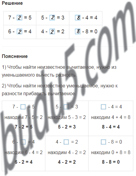 В нашем справочнике повтори состав чисел от 1 до 10, вспомни, как называются числа при вычитании и как находить неизвестное вычитаемое и уменьшаемое.