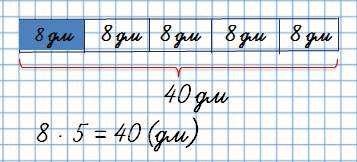 Лента состоит из 5 частей по 8 дм каждая. Чтобы найти длину всей ленты, нужно длину одной части умножить на количество таких частей.