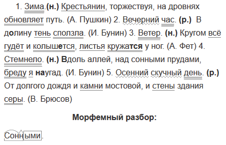 1. Зима. Крестьянин, торжествуя, на дровнях обновляет путь. (А. Пушкин) 2. Вечерний час. В д..лину тень сползла. (И. Бунин) 3. Ветер. Кругом всё гудёт и колышется, листья кружат(?)ся у ног. (А. Фет) 4. Стемнело. (В)доль аллей, над сонными2 прудами, бреду я (на)угад. (И. Бунин) 5. Осенний скучный1 день. От долгого дождя и камни мостовой, и стены здания серы. (В. Брюсов)