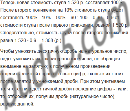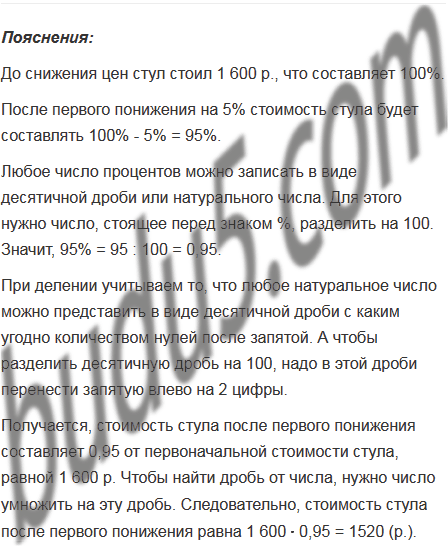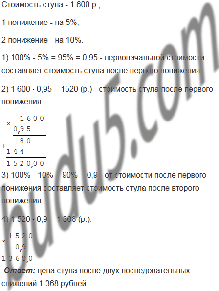 До снижения цен стул стоил 1 600 р. Какой стала цена стула после двух последовательных снижений, первое из которых было на 5%, а второе - на 10%?