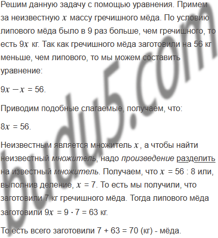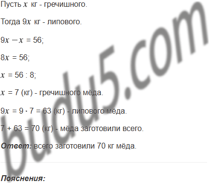 Заготовили липовый и гречишный мёд, причём липового мёда было в 9 раз больше, чем гречишного. Сколько всего килограммов мёда заготовили, если гречишного заготовили на 56 кг меньше, чем липового?
