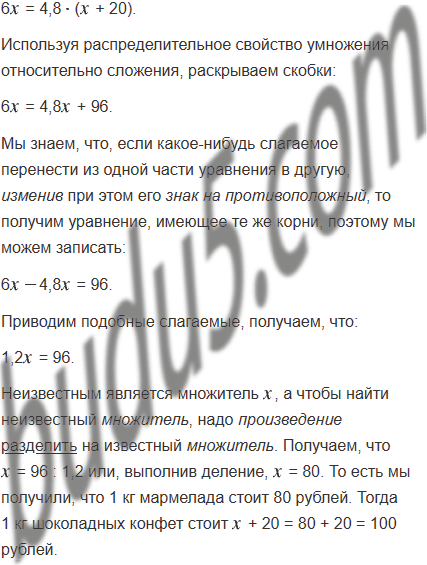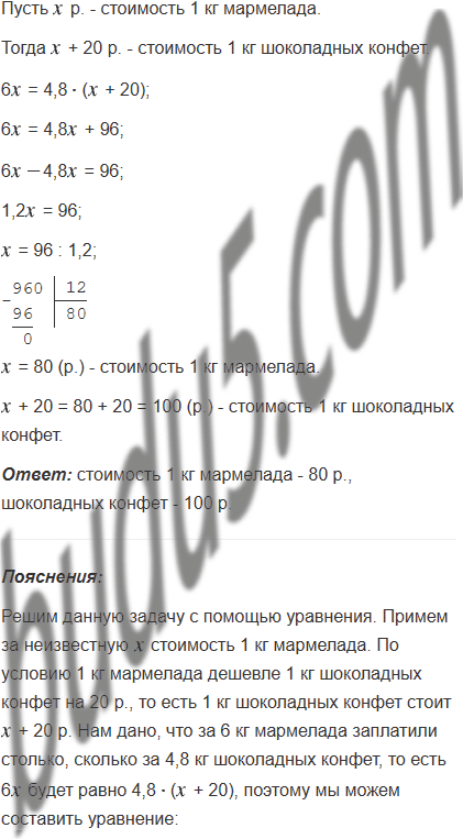 За 6 кг мармелада заплатили столько, сколько за 4,8 кг шоколадных конфет. Какова цена каждого вида сладостей, если 1 кг мармелада дешевле 1 кг шоколадных конфет на 20 р.?