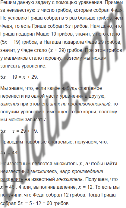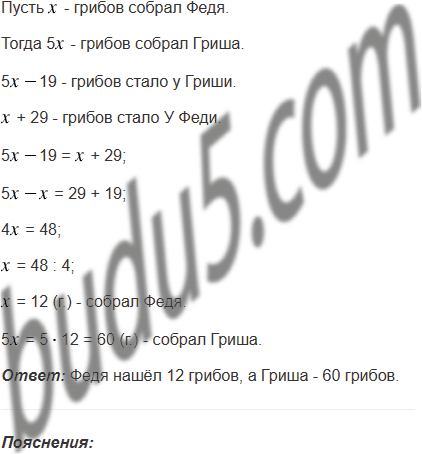 Гриша и Федя собирали грибы. Гриша собрал в 5 раз больше грибов, чем Федя. В лесу они встретили Машу и Наташу. Гриша подарил Маше 19 грибов, а Наташа подарила Феде 29 грибов. После этого грибов у мальчиков стало поровну. Сколько грибов нашёл каждый мальчик?