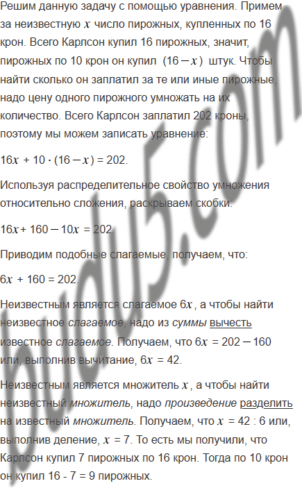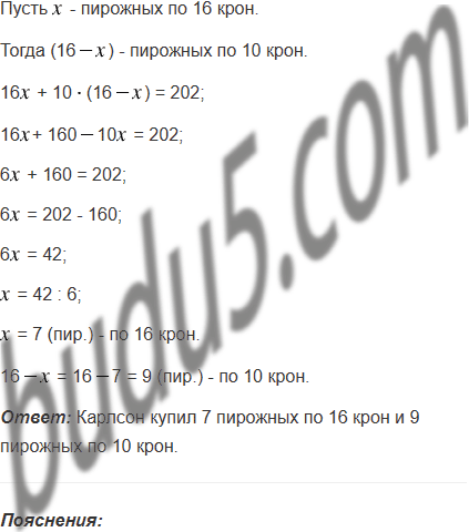 Карлсон купил 16 пирожных по 10 и по 16 крон, заплатив всего 202 кроны. Сколько пирожных каждого вида купил Карлсон?