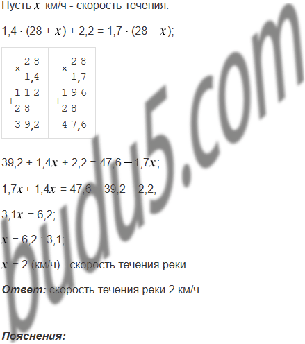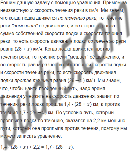 Лодка плыла 1,4 ч по течению реки и 1,7 ч против течения. Путь, который проплыла лодка по течению, оказался на 2,2 км меньше пути, который она проплыла против течения. Найдите скорость течения реки, если скорость лодки в стоячей воде 28 км/ч.