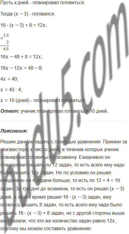 Готовясь к экзамену, ученик планировал ежедневно решать 12 задач. Однако он решал ежедневно на 4 задачи больше, и уже за три дня до экзамена ему осталось решить 8 задач. Сколько дней ученик планировал готовиться к экзамену?