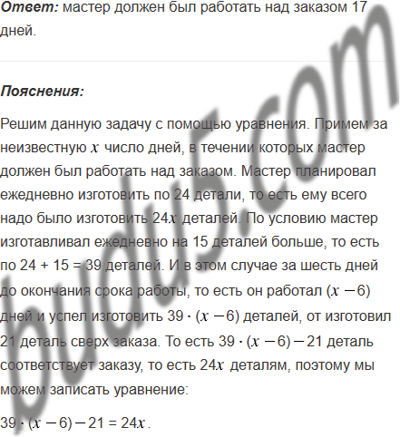 Мастер планировал ежедневно изготовить по 24 детали, чтобы выполнить заказ вовремя. Но поскольку он изготавливал ежедневно на 15 деталей больше, то уже за шесть дней до окончания срока работы он изготовил 21 деталь сверх заказа. Сколько дней мастер должен был работать над заказом?