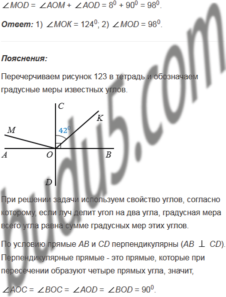 На рисунке 123 АВ СD, МОС + ВОК = 1300, СОК = 420. Вычислите: 1) МОК; 2) МОD.