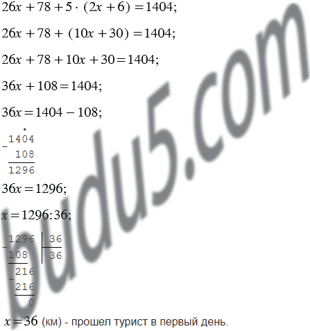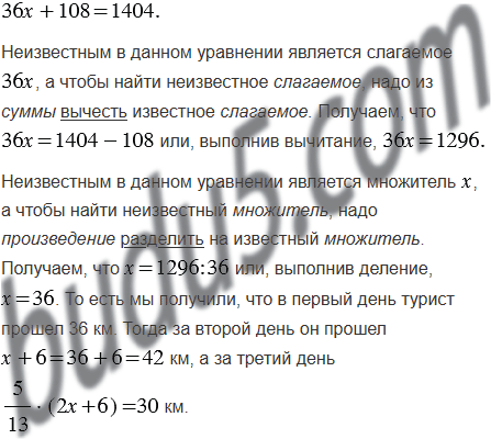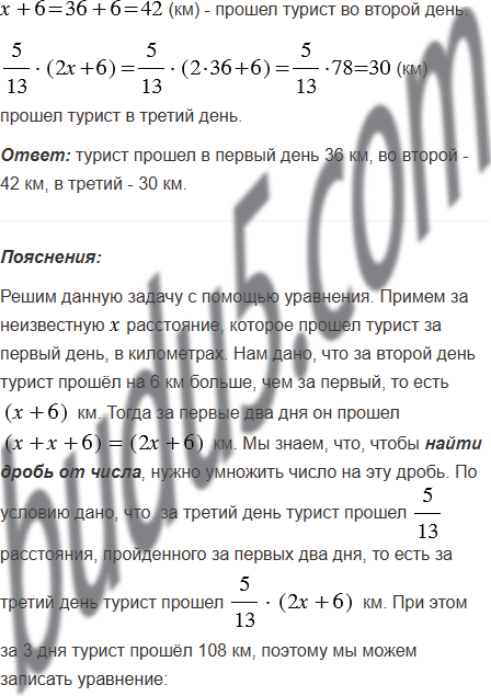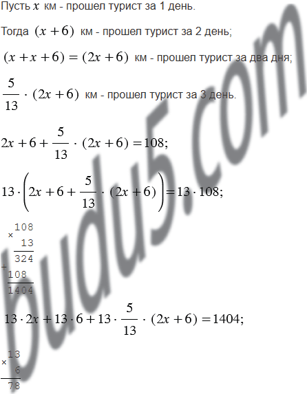 За 3 дня турист прошёл 108 км. За второй день он прошёл на 6 км больше, чем за первый, а за третий - расстояния, пройденного за первых два дня. Сколько километров турист прошёл за каждый из этих дней?