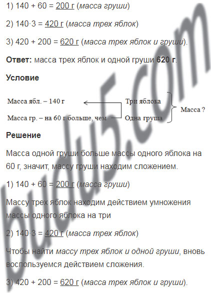 Масса яблока 140 г, а масса груши на 60 г больше. Какова масса трёх таких яблок и груши?