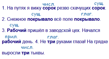 1. На путях я вижу сорок резво скачущих сорок. 2. Снежное покрывало всё поле покрывало. 3. Рабочий пришёл в заводской цех. Начался рабочий день. 4. Не три руками глаза! На грядке выросли три тыквы.
