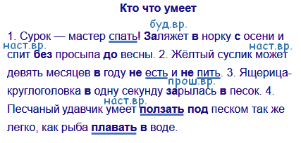 1. Сурок - мастер спать! (За)ляжет (в)норку (с)осени и спит (без)просы́па (до)весны. 2. Жёлтый суслик может девять месяцев (в)году (не)есть и (не)пить. 3. Ящерица-круглоголовка (в)одну секунду (за)рылась (в)песок. 4. Песчаный3 удавчик умеет ползать (под)песком так же легко, как рыба плавать (в)воде.